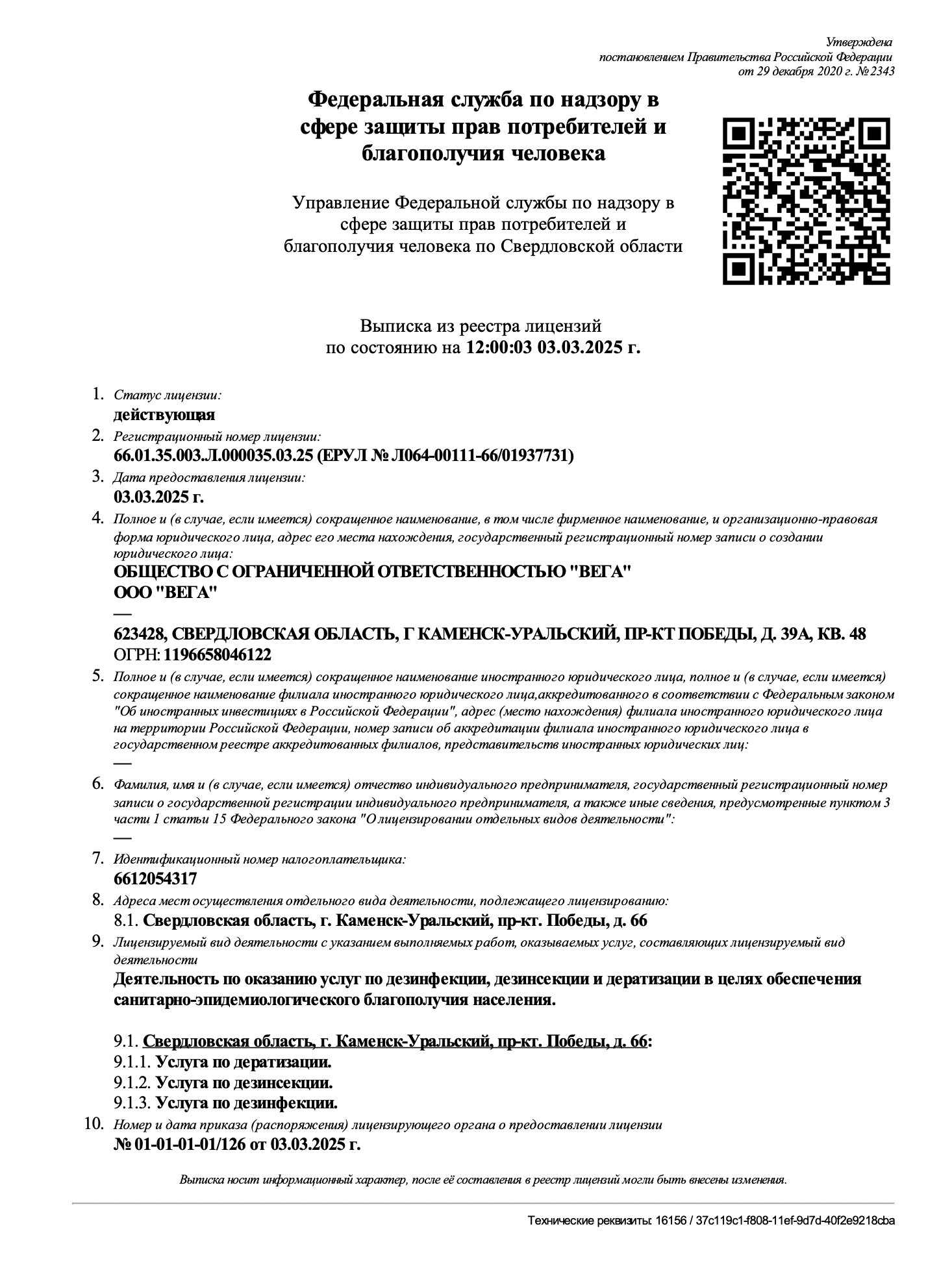 ООО "Вега" ИНН / ОГРН 6612054317/ 1196658046122 Лицензия 66.01.35.003.Л.000035.03.25 (ЕРУЛ № Л064-00111-66/01937731) |